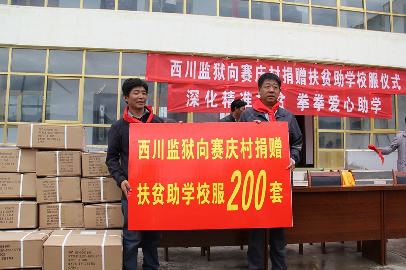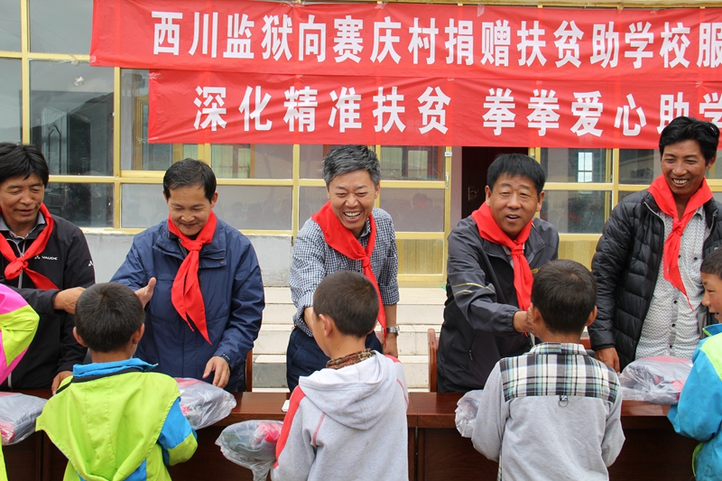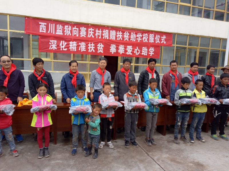 助学校服捐赠仪式在赛庆村乡亲和学生代表们的热烈掌声中开始,由驻村第一书记孙斌同志主持。瓜什则乡领导在致辞中对西川监狱开展联点扶贫以来为赛庆村早日脱贫所作出的积极努力和务实举措表达了诚挚的谢意,并表示在双方共同努力下,赛庆村一定会如期脱贫。监狱党委副书记、总经理王建国同志代表监狱党委向赛庆村捐赠了204套助学校服,并向当地干部、群众致以问候,说明了此行的来意和目的。他说,扶贫要先扶智,如果我们忽视了对下一代的培养教育,那么精准扶贫就会成为无源之水、无本之木,就无法彻底摆脱贫困的影子,教育扶贫就是要阻止贫困的传递、蔓延,让孩子成为彻底甩掉贫困包袱的根本力量。此次监狱出资出力为孩子们制作了崭新的校服,就是希望孩子们能够快乐学习,快乐成长,从小树立远大的理想,孕育高尚的情操,养成良好的习惯,长大后为家乡建设贡献力量。在今后的精准扶贫工作中,西川监狱会继续尽己所能的为赛庆村提供实实在在的帮助,希望赛庆村的乡亲们能齐心协力、发掘潜力、积蓄动力,不断提升自我发展能力,加强公共基础建设、促进劳务输出和运输能力,优化拓宽乳制品等优势资源的开发、生产、销售渠道,扩大群众就业面,推动传统畜牧向科学畜牧的过渡发展,构建自成一体的产业经济,持续提高全村经济收入,争取早日实现全面脱贫。