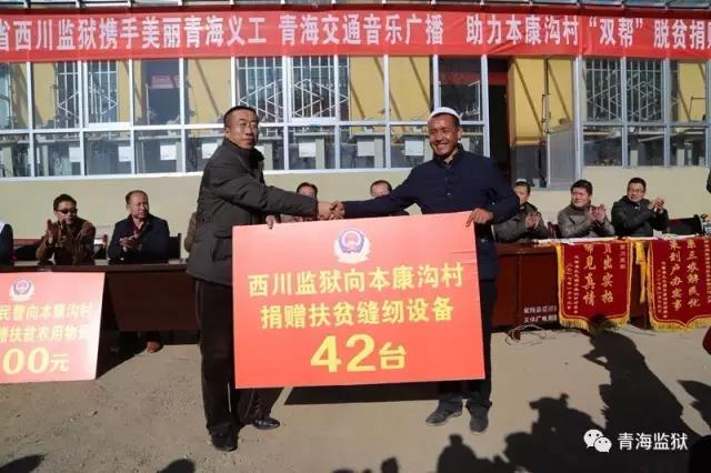 金渤监狱长代表西川监狱全体民警向本康沟村捐赠42台缝纫设备及价值8000元的农用物资。美丽青海义工代表向村学生代表捐赠衣服、书包等,为缝纫学习班代表捐赠围巾。在第一书记的沟通协调下,在县就业局相关部门的帮助下,全村50名留守妇女免费上了为期40天的缝纫工培训班,村民享受到了实实在在的帮扶成果,为西川监狱送上“扶贫出实招,双帮见真情”的锦旗,为本康沟村村委会送上“情系三农解民忧,政策到户办实事”的锦旗。