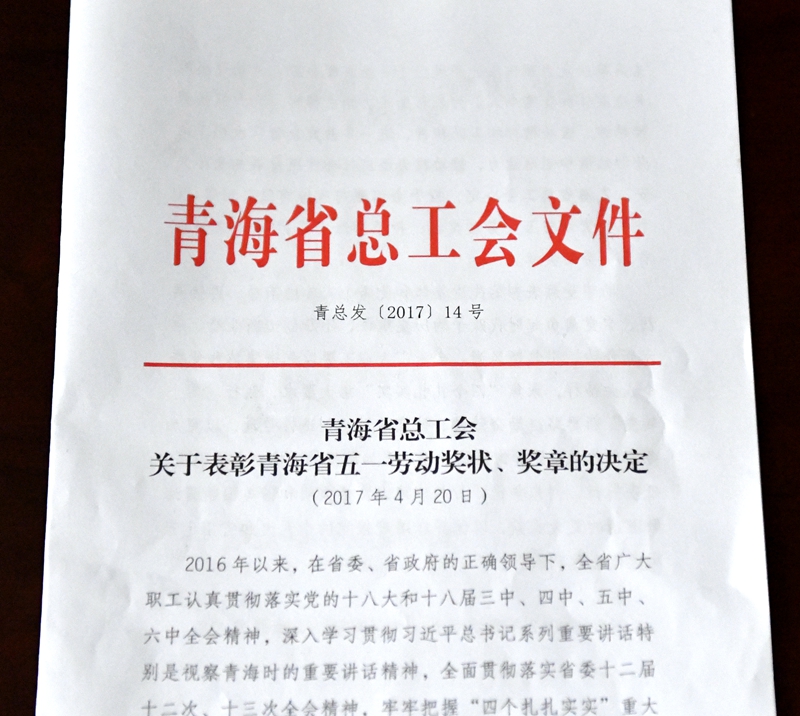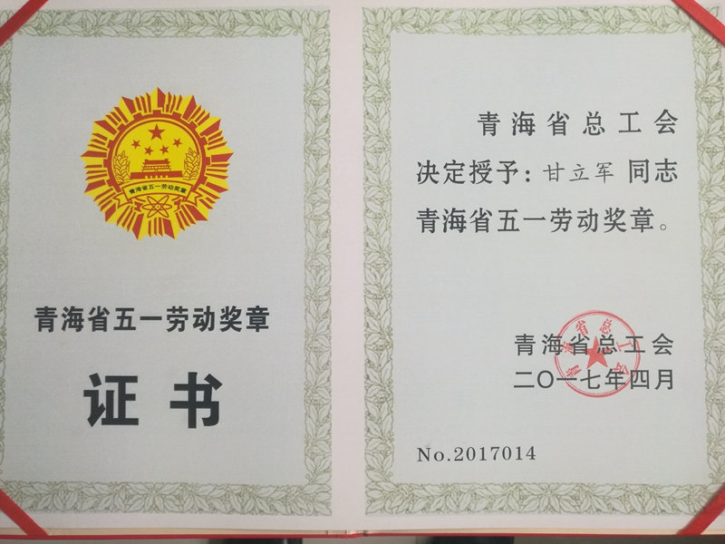 热烈祝贺甘立军同志荣获“青海省五一劳动奖章”