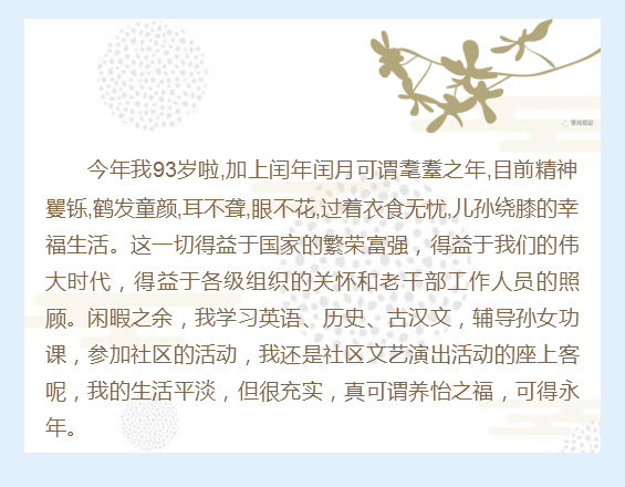 今天,小编带大家一起走进“展示阳光心态,体验美好生活,畅谈发展变化”主题活动系列之--《乐享晚年》。