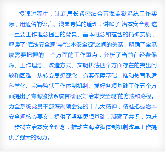 11月23日下午,在青海省司法厅举办的学习宣传贯彻党的十九大精神培训班上,厅党组成员、副厅长,省监狱管理局分党组书记、局长沈森结合自身学习党的十九大报告情况,在司法厅主会场讲解了对党的十九大精神的六个方面的新认识和新感受。并结合新时代党对监狱工作的新要求,对标监狱工作的初心和使命,以践行治本安全观,推动党的十九大精神贯彻落实为主题,围绕治本安全观“是什么、干什么、怎么干”三个方面的问题,进行了细致的讲解。