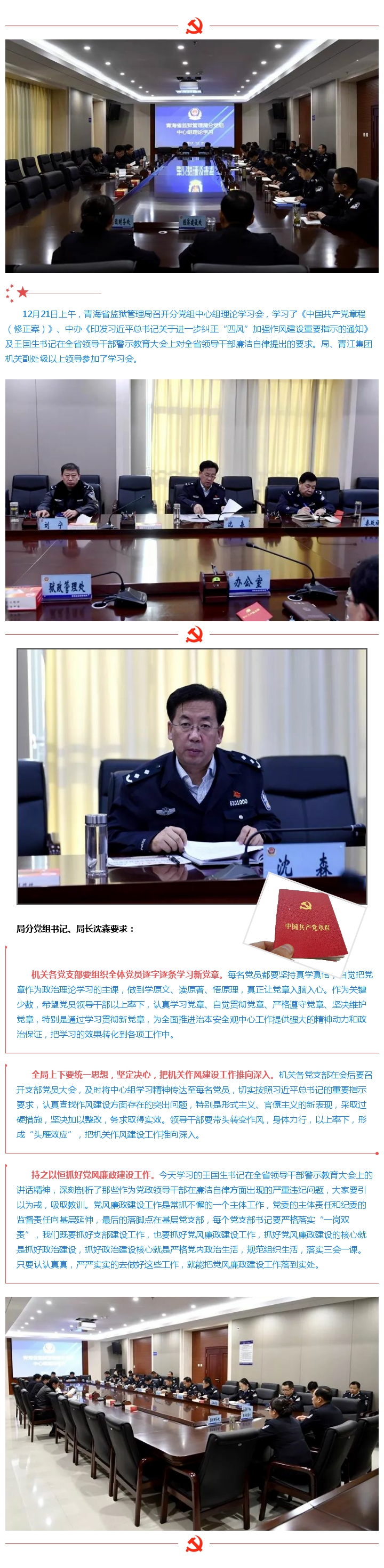 青海省监狱管理局分党组召开中心组理论学习会 来源:局直属机关党委 发布时间:2017-12-22 02:21:46 浏览次数: 次 【字体:小 大】 12月21日上午,青海省监狱管理局召开分党组中心组理论学习会,学习了《中国共产党章程(修正案)》、中办《印发习近平总书记关于进一步纠正“四风”加强作风建设重要指示的通知》及王国生书记在全省领导干部警示教育大会上对全省领导干部廉洁自律提出的要求。局、青江集团机关副处级以上领导参加了学习会。 分享到: 【打印正文】