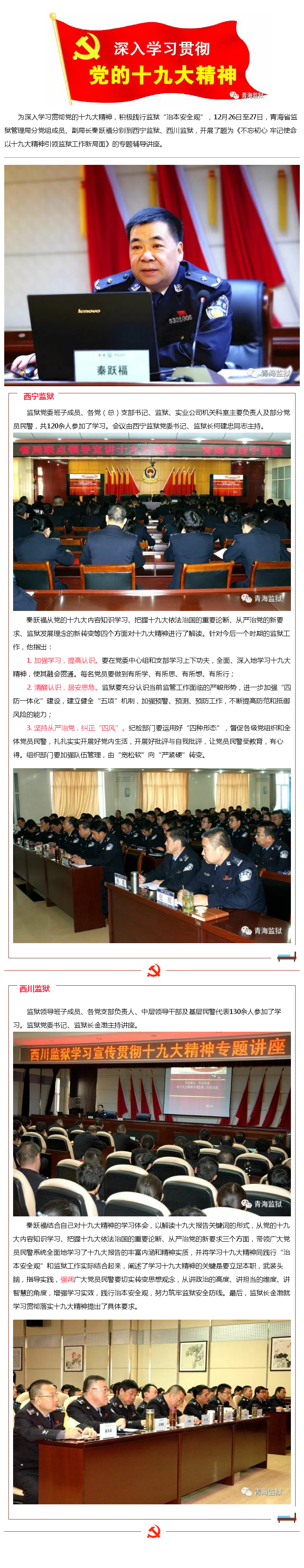 【十九大】不忘初心 牢记使命 以十九大精神引领监狱工作新局面 来源: 发布时间:2018-01-02 01:42:39 浏览次数: 次 【字体:小 大】 为深入学习贯彻党的十九大精神,积极践行监狱“治本安全观”,12月26日至27日,青海省监狱管理局分党组成员、副局长秦跃福分别到西宁监狱、西川监狱,开展了题为《不忘初心 牢记使命 以十九大精神引领监狱工作新局面》的专题辅导讲座。 分享到: 【打印正文】