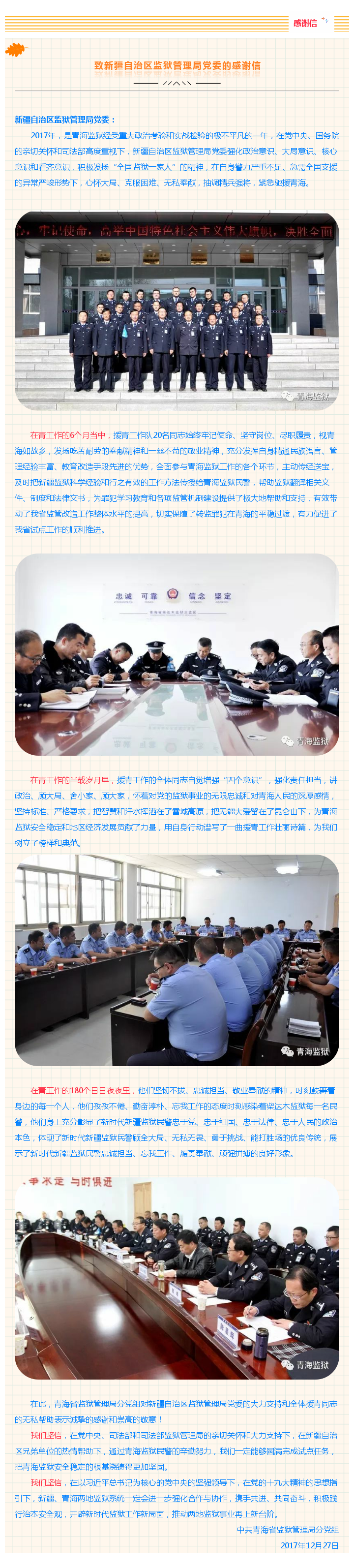 致新疆自治区监狱管理局党委的感谢信 来源: 发布时间:2018-01-02 02:43:03 浏览次数: 次 【字体:小 大】 2017年,是青海监狱经受重大政治考验和实战检验的极不平凡的一年,在党中央、国务院的亲切关怀和司法部高度重视下,新疆自治区监狱管理局党委强化政治意识、大局意识、核心意识和看齐意识,积极发扬“全国监狱一家人”的精神, 分享到: 【打印正文】