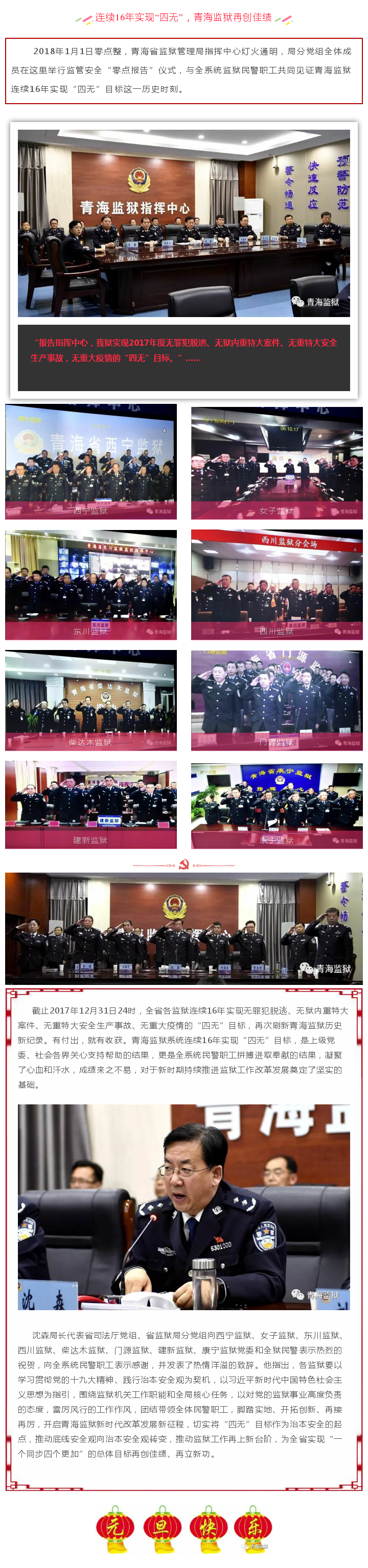连续16年实现“四无” 青海监狱再创佳绩 来源: 发布时间:2018-01-02 02:56:50 浏览次数: 次 【字体:小 大】 2018年1月1日零点整,青海省监狱管理局指挥中心灯火通明,局分党组全体成员在这里举行监管安全“零点报告”仪式,与全系统监狱民警职工共同见证青海监狱连续16年实现“四无”目标这一历史时刻。 分享到: 【打印正文】