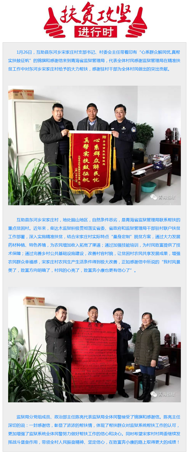 精准扶贫暖人心 感恩帮扶送锦旗 来源: 发布时间:2018-01-29 11:37:14 浏览次数: 次 【字体:小 大】 1月26日,互助县东河乡宋家庄村支部书记、村委会主任带着印有“心系群众解民忧,真帮实扶鼓征帆”的锦旗和感谢信来到青海省监狱管理局, 分享到: 【打印正文】