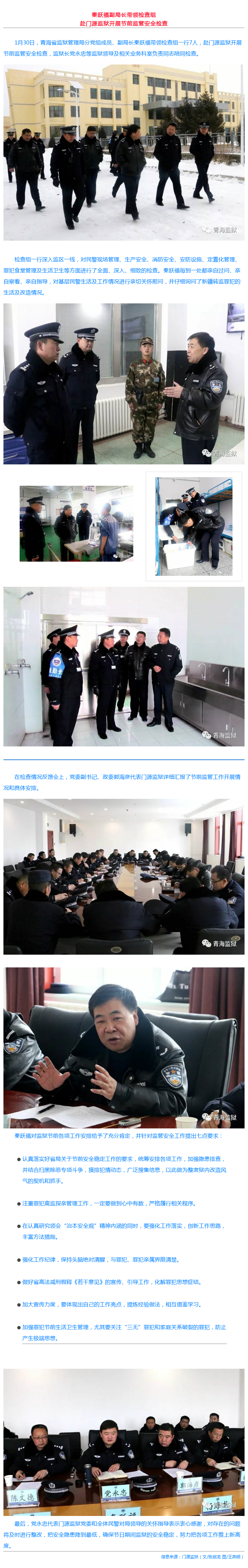 深入实地细查 确保监狱安全 来源:青海省门源监狱 发布时间:2018-02-02 10:28:26 浏览次数: 次 【字体:小 大】 1月30日,青海省监狱管理局副局长秦跃福带领检查组一行7人,赴门源监狱开展节前监管安全检查,监狱长党永忠等监狱领导及相关业务科室负责同志陪同检查。 分享到: 【打印正文】