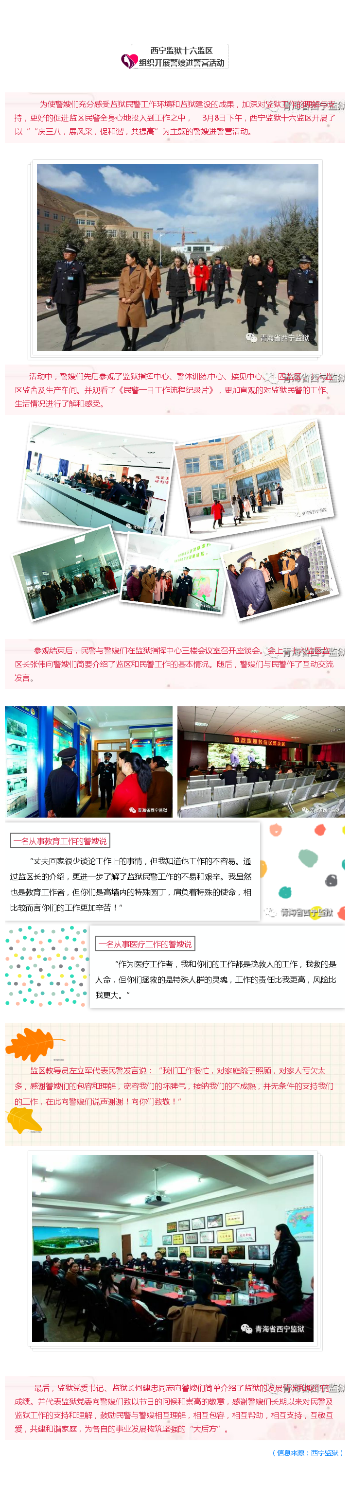 最美人间三月天 情满警营一家亲 来源:西宁监狱 发布时间:2018-03-15 09:48:57 浏览次数: 次 【字体:小 大】 月8日下午,西宁监狱十六监区开展了以““庆三八,展风采,促和谐,共提高”为主题的警嫂进警营活动。 分享到: 【打印正文】