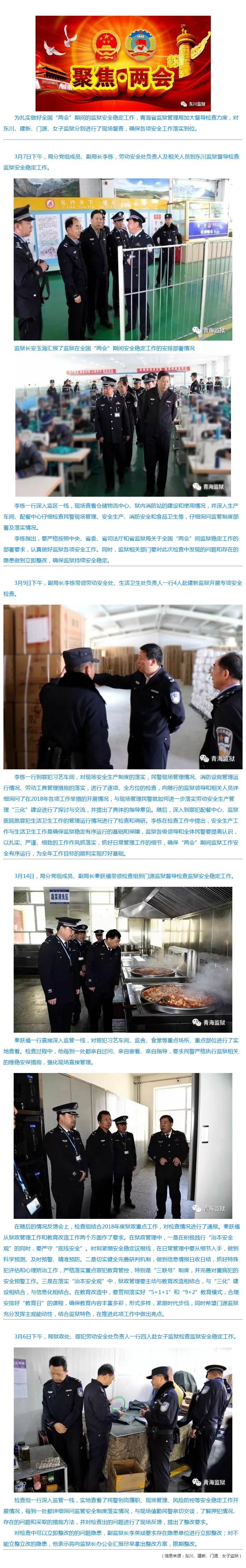 扎实开展督导检查工作 确保监狱持续安全稳定 来源: 发布时间:2018-03-16 15:34:29 浏览次数: 次 【字体:小 大】 为扎实做好全国“两会”期间的监狱安全稳定工作,青海省监狱管理局加大督导检查力度,对东川、建新、门源、女子监狱分别进行了现场督查,确保各项安全工作落实到位。 分享到: 【打印正文】