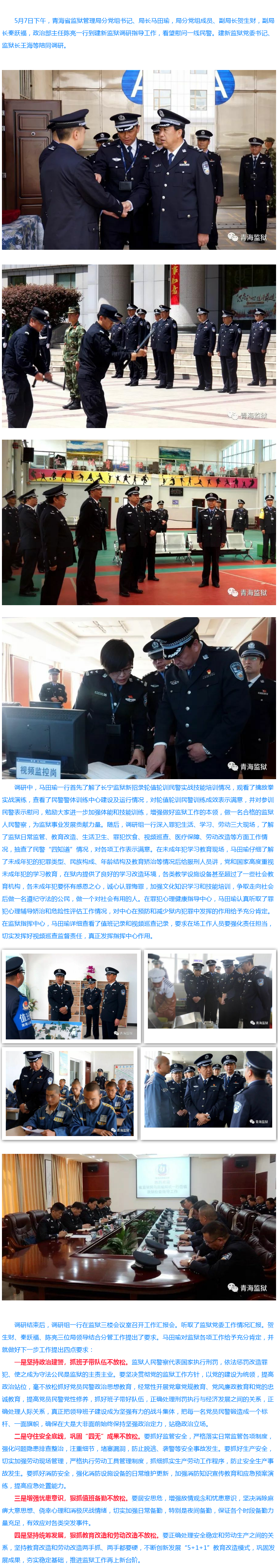 监狱局领导赴建新监狱调研指导工作 来源:局办公室 发布时间:2018-05-09 03:57:45 浏览次数: 次 【字体:小 大】 5月7日下午,青海省监狱管理局分党组书记、局长马田瑜,局分党组成员、副局长贺生财,副局长秦跃福,政治部主任陈亮一行到建新监狱调研指导工作,看望慰问一线民警。 分享到: 【打印正文】