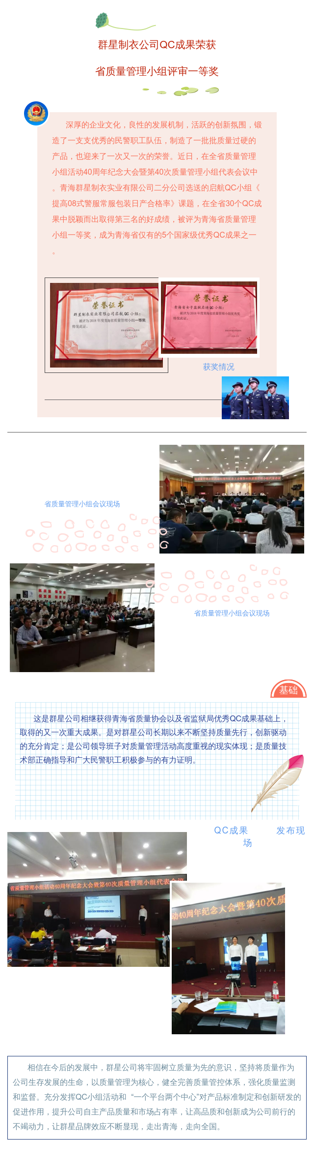 群星制衣公司QC成果荣获一等奖 来源:女子监狱 发布时间:2018-07-24 02:34:53 浏览次数: 次 【字体:小 大】 7月12日,在全省质量管理小组活动40周年纪念大会暨第40次质量管理小组代表会议中 分享到: 【打印正文】