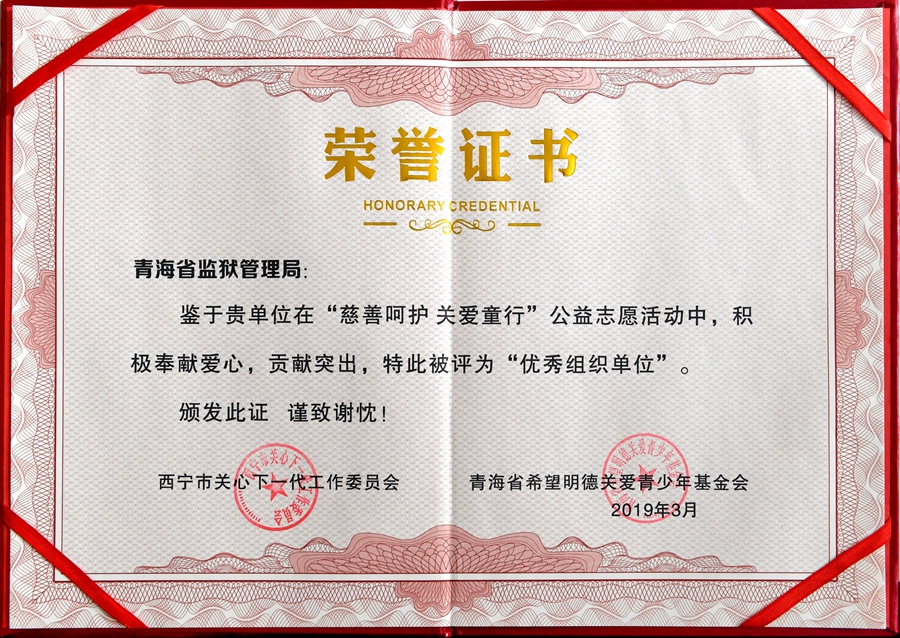 3月21日上午,西宁市政协会议室人声鼎沸,庄重热烈。西宁市关心下一代工作委员会在这里隆重举办“慈善呵护关爱童行”交通防护学习包捐赠仪式。捐赠活动是以守护少年儿童安全出行,促进少年儿童安全成长为宗旨,动员社会力量奉献爱心,为少年儿童捐赠交通防护学习包,让平安健康、和谐欢乐伴随少年儿童茁壮成长。省监狱局关心下一代工作委员会急党政所急、想青少年所需、尽关工委所能,积极响应,迅速行动,广大民警职工和离退休干部慷慨解囊、奉献爱心,共计捐款68000余元,受到西宁市政府和关心下一代工作委员会的高度赞扬,并被评为“慈善呵护、关爱童行”捐赠活动优秀组织奖。