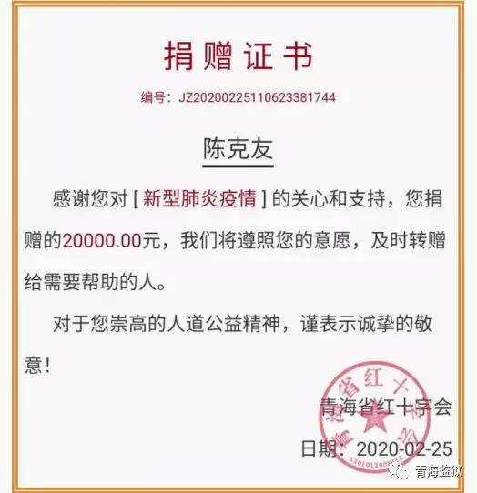 2月25日,青海省女子监狱离休干部陈克友向青海省红十字会捐款20000元,用于抗击新冠肺炎疫情。
