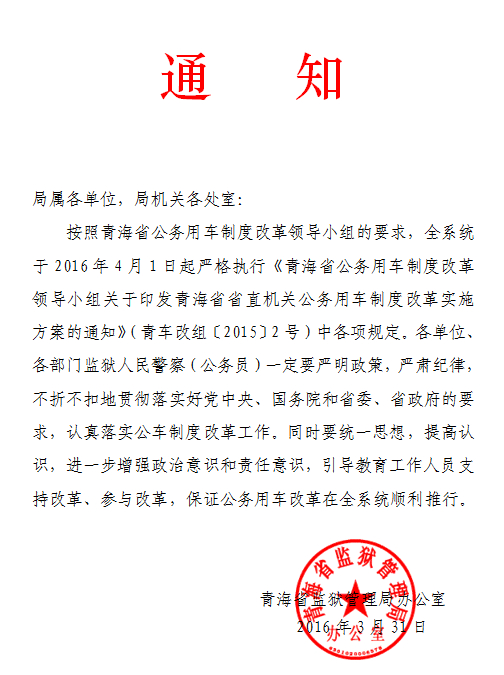 青海省监狱管理局办公室关于严格执行公务用车改革规定的通知