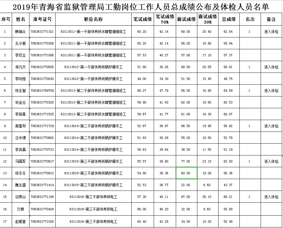 附件:2019年青海省监狱管理局工勤岗位工作人员总成绩公布及体检人员名单