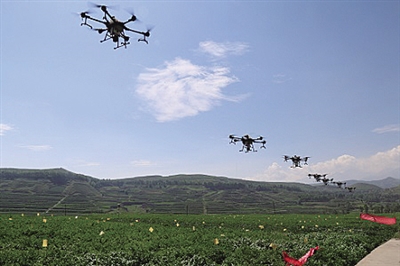7月22日,乐都瞿昙镇风和日丽,蔚蓝的天空云朵洁白。在全国马铃薯绿色高质高效行动万亩示范区,10架装载好低毒、无残留、环境友好型农药的无人机同时起飞,进行无人机专业化马铃薯晚疫病统防统治。壮观的场面,令观摩者不断赞叹。